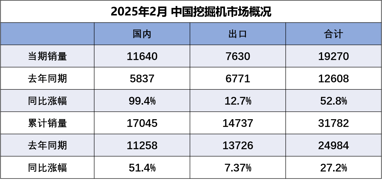據中國工程機械工業協會對挖掘機主要制造企業統計,2025年2月銷售各類挖掘機19270臺,同比增長52.8%。其中國內銷量11640臺,同比增長99.4%;出口量7630臺,同比增長12.7%。2025年1—2月,共銷售挖掘機31782臺,同比增…......