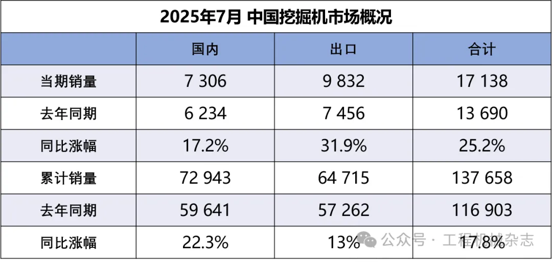 日前,中國工程機械工業協會發布數據,7月份,國內挖掘機主要制造企業銷售各類挖掘機17138臺,同比增長25.2%。其中國內銷量7306臺,同比增長17.2%,出口量9832臺,同比增長31.9%,挖掘機月平均工作時長為66.1小時,月…......