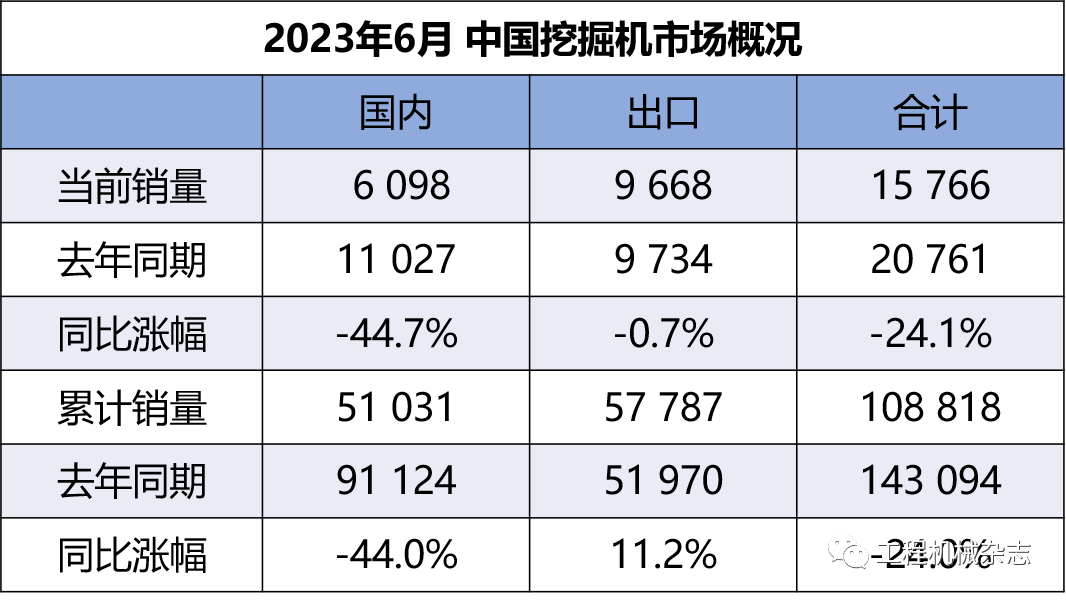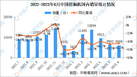 據中國工程機械工業協會對挖掘機主要制造企業統計,2023年6月銷售各類挖掘機15766臺,同比下降24.1%,其中國內6098臺,同比下降44.7%;出口9668臺,同比下降0.68%。2023年1-6月,共銷售挖掘機108818臺,同比下降24%;…......