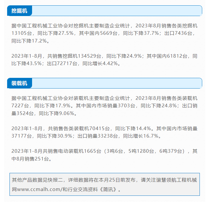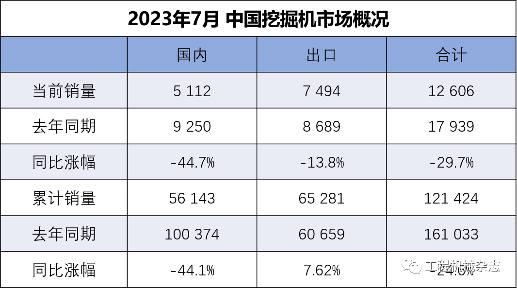 機械工業協會對挖掘機主要制造企業統計,2023年7月銷售各類挖掘機12606臺,同比下降29.7%,其中國內5112臺,同比下降44.7%;出口7494臺,同比下降13.8%。2023年1-7月,共銷售挖掘機121424臺,同比下降24.6%;其中國內…......
