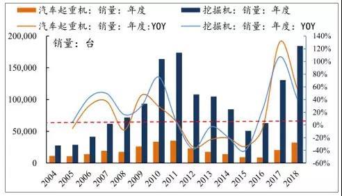 挖機和起重機的應(yīng)用場景重合度非常高。2018年挖機和汽車起重機銷量分別為18.4萬臺和3.2萬臺,挖機銷量超過歷史高點。