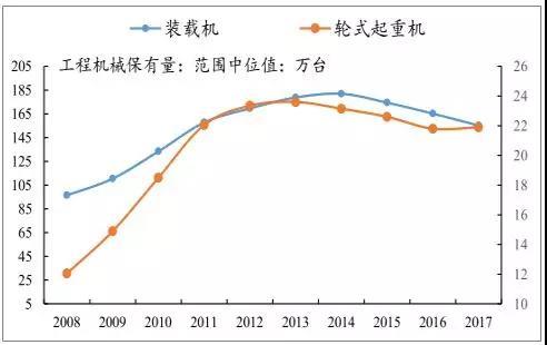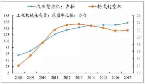 根據(jù)工程機械協(xié)會公布的工程機械保有量,截至2017年底,挖機和輪式起重機的保有量分別為155.7~168.6萬臺和21~22.8臺,根據(jù)歷年保有量范圍的中位數(shù),近年來挖機保有量保持緩慢增長,而起重機保有量甚至在2013年高點之后出現(xiàn)下滑。