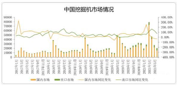 按照CME預(yù)測計算,2021年1-6月挖掘機銷量221233臺,同比增速29.8%,其中國內(nèi)市場192235臺,同比增速23.3%;出口市場28998臺,同比增速99.5%。